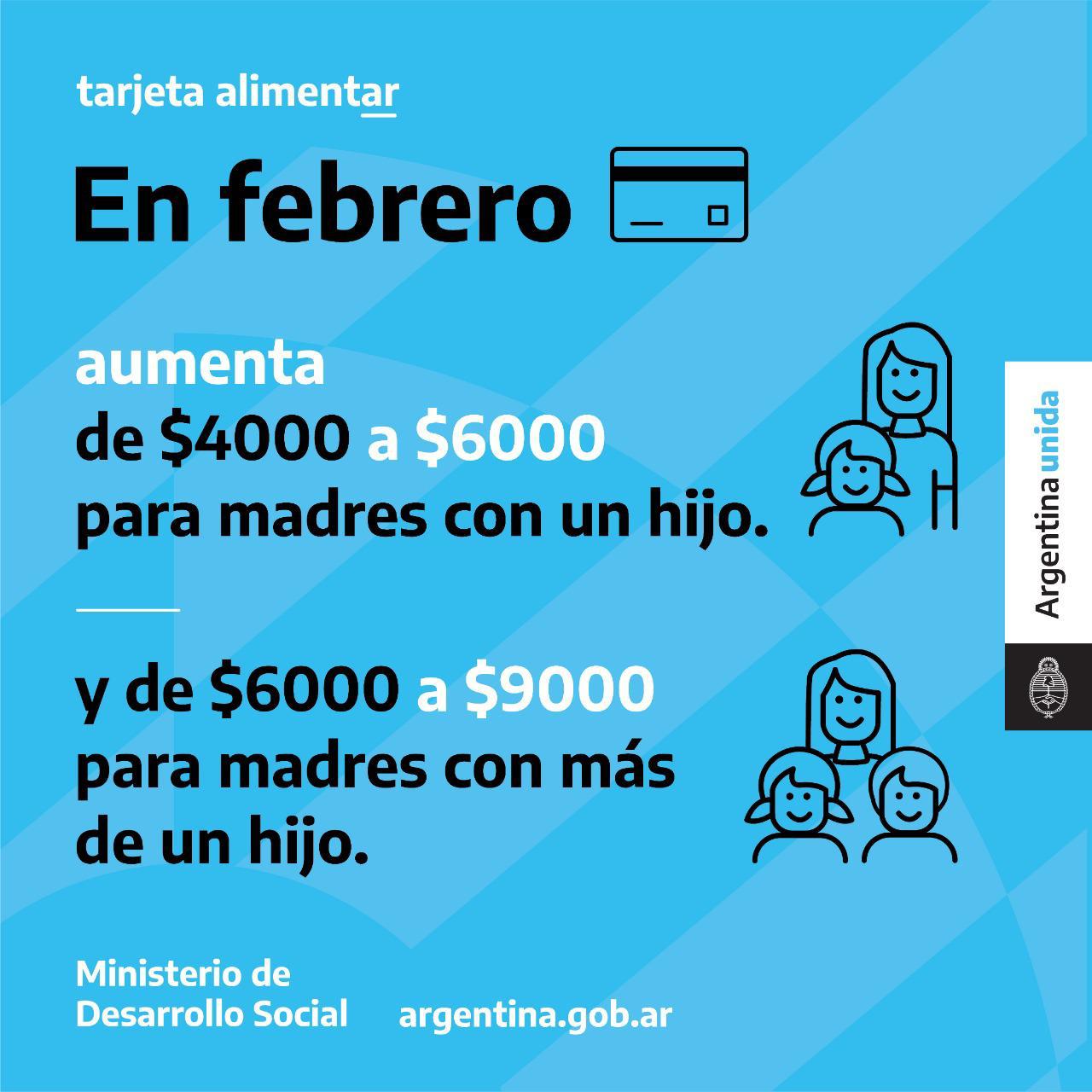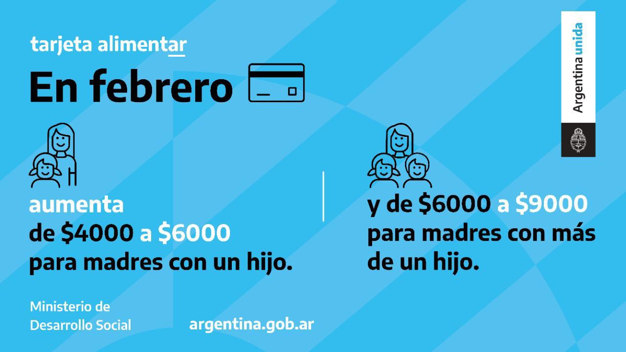 En el marco del Plan Argentina contra el hambre, la tarjeta Alimentar promueve el acceso a alimentos sanos, seguros y saludables, aumentando los ingresos de las familias y generando más fuentes de trabajo. Está dirigida a madres o padres con hijos e hijas de hasta 6 años de edad que reciben la AUH. También a embarazadas a partir de los 3 meses que cobran la asignación por embarazo y personas con discapacidad que reciben la AUH.