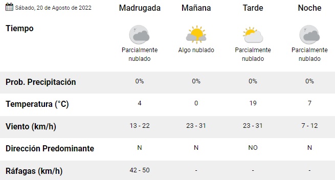 El parte del servicio meteorológico prevé que para después del mediodía el cielo estará mayormente nublado y los vientos del sector noroeste tendrán velocidades estimadas entre 23 y 31km/h. La temperatura pronosticada sería de 19 grados.