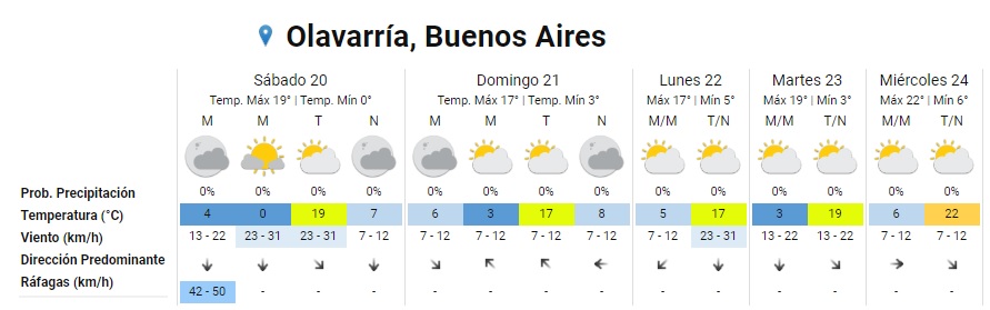 El pronóstico del tiempo para la ciudad de Olavarría, indica que hoy 20 de agosto el cielo estará parcialmente nublado por la madrugada y la temperatura rondará entre 4 grados de mínima y los 19 de máxima.