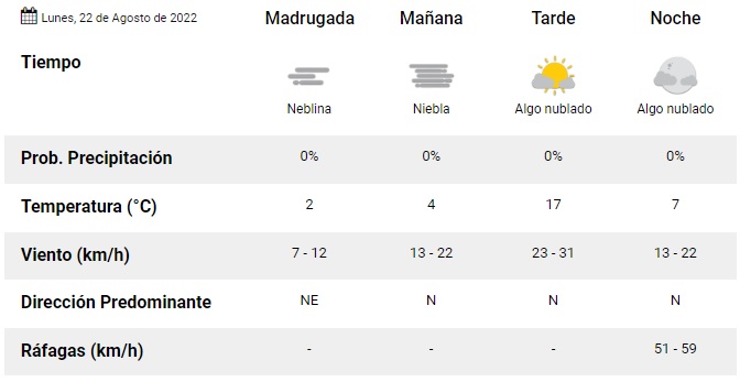 De acuerdo al parte Servicio Meteorológico Nacional, el clima se presentaría sin lluvias , y los vientos del norte correrán a una velocidad de entre 7 y 12 kilómetros por hora. La humedad sería del 20 por ciento.