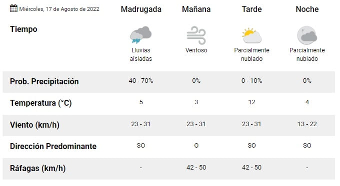 A la noche, el clima rondará los 5 grados, mientras que los vientos serán del sudoeste a una velocidad de 23 y 31 kilómetros por hora. No se esperan lluvias para esta franja del día.