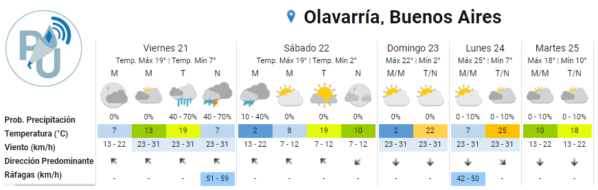 El Servicio Meteorológico Nacional anticipa que este viernes 21 de octubre, la temperatura rondará entre 7 y 19 grados; Se anticipan lluvias y tormentas aisladas durante la tarde noche en Olavarría.