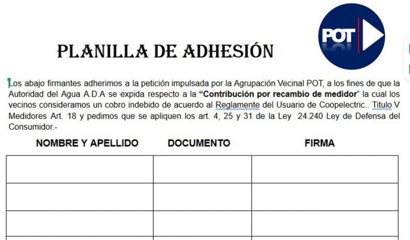 En este sentido Andrea Coronel referente del espacio vecinal expresó “manifestamos nuestra oposición rotunda desde la creación de este ítem en la facturación de agua, luego de una presentación en la Defensoria del Pueblo, “aun sin respuesta” es que iniciamos una junta de firmas en los distintos barrios de nuestra ciudad, para ser acompañadas junto a un petitorio dirigido a la Autoridad del Agua A.D.A con copia a INAES.- Contra la “Contribución por recambio de medidor”.