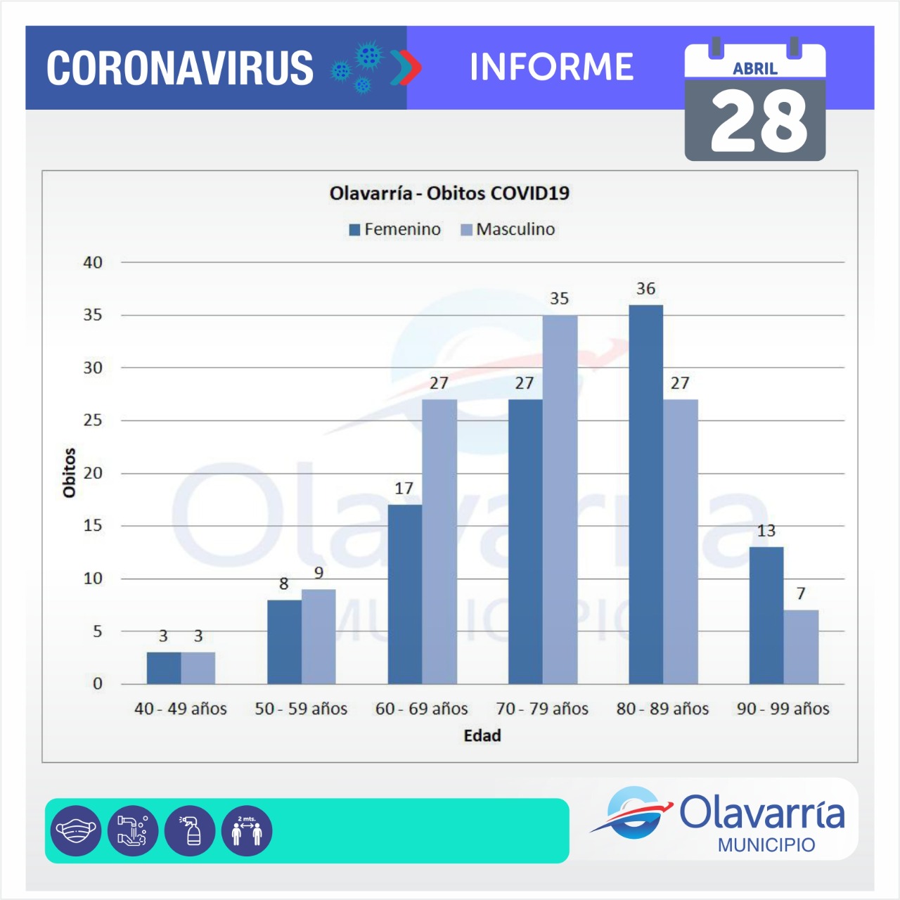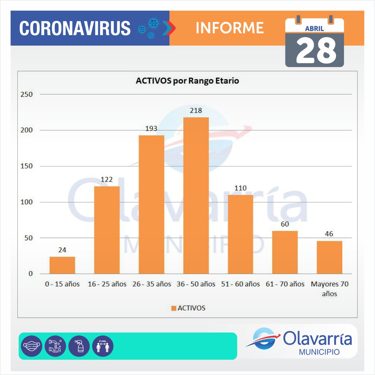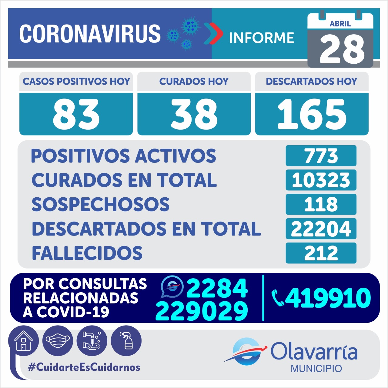 Este miércoles 28 de abril se registraron 83 casos positivos, 38 altas médicas y 165 descartados.