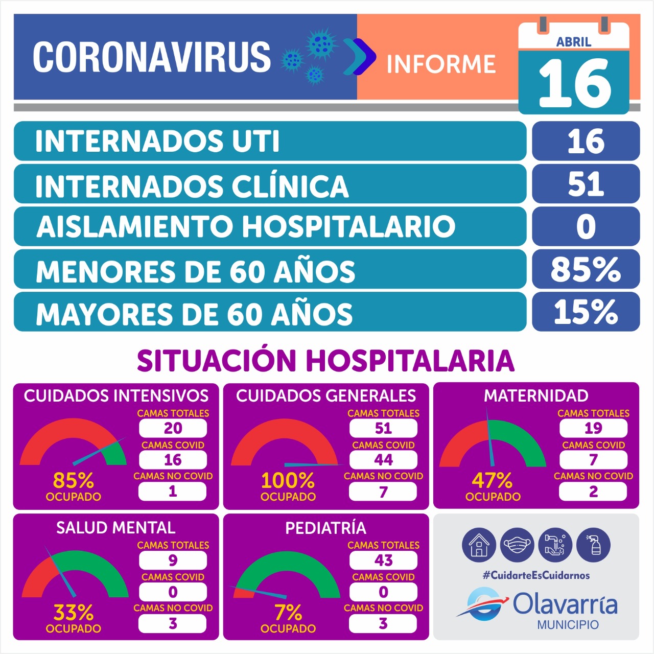 Sobre el estado actual del Hospital, se indicó que hay dieciséis pacientes en Unidad de Terapia Intensiva y cincuenta y uno en Cuidados Generales.