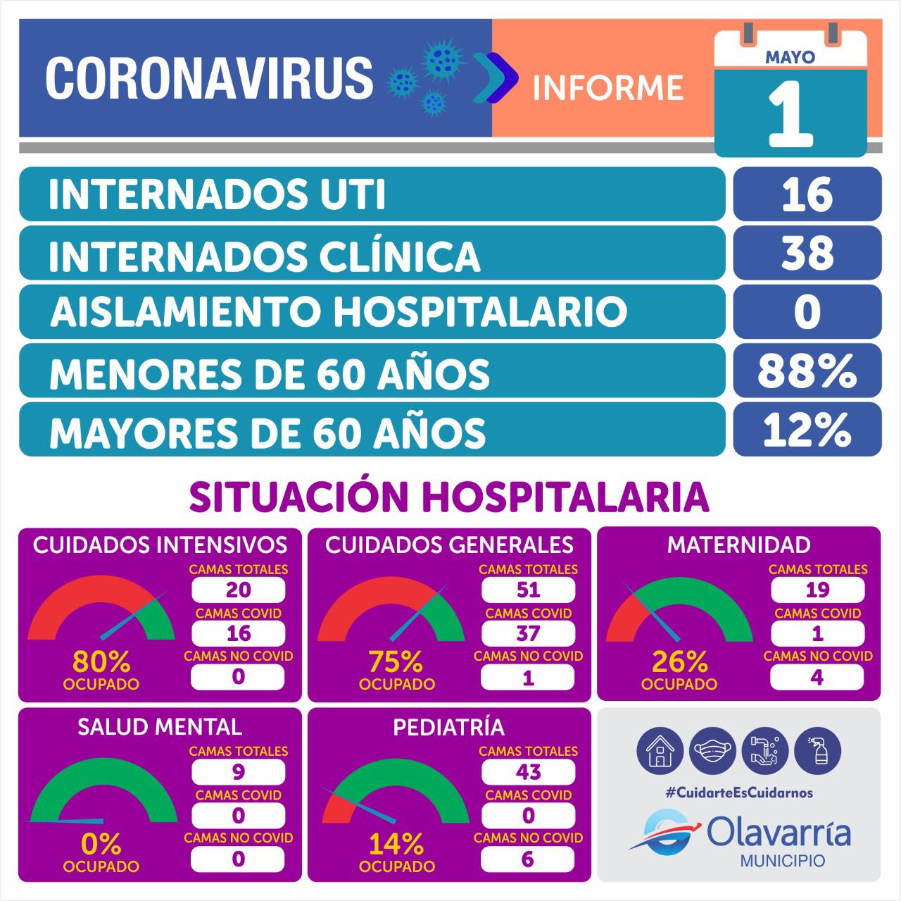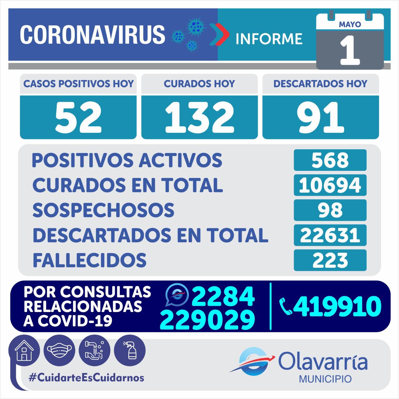 En el día de la fecha 1 de mayo se registraron 52 casos positivos, 132 altas médicas y 91 descartados.