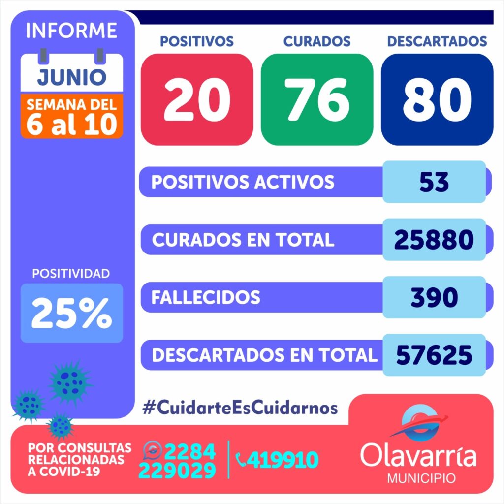 En la semana 76 pacientes recibieron el alta médica, por lo que son 53 las personas que transitan la enfermedad en Olavarría. La mayoría de los pacientes activos tiene menos de 60 años.