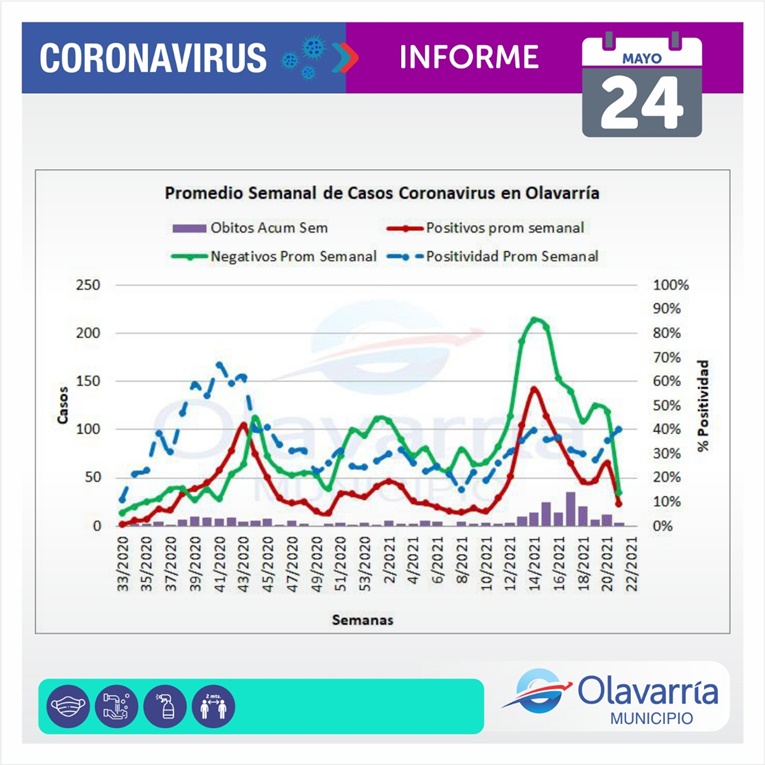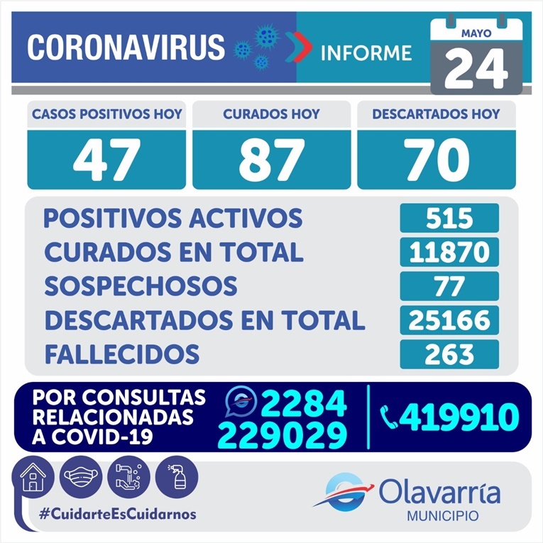 En la fecha de hoy 24 de mayo se registraron 47 casos positivos, 97 altas médicas y 70 descartados.