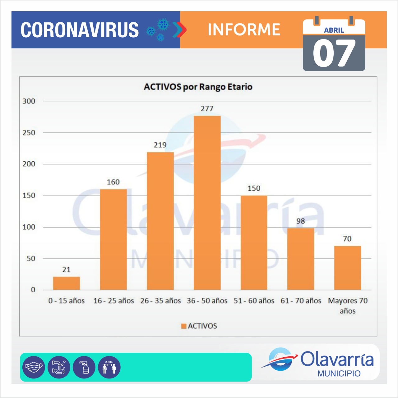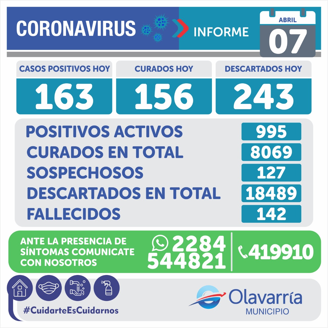 En la fecha de hoy 7 de abril se registraron 163 positivos activos, 156 altas médicas y 243 descartados.
