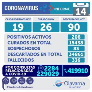 • Informe sanitario: Se registraron 19 casos positivos de coronavirus y 26 altas médicas