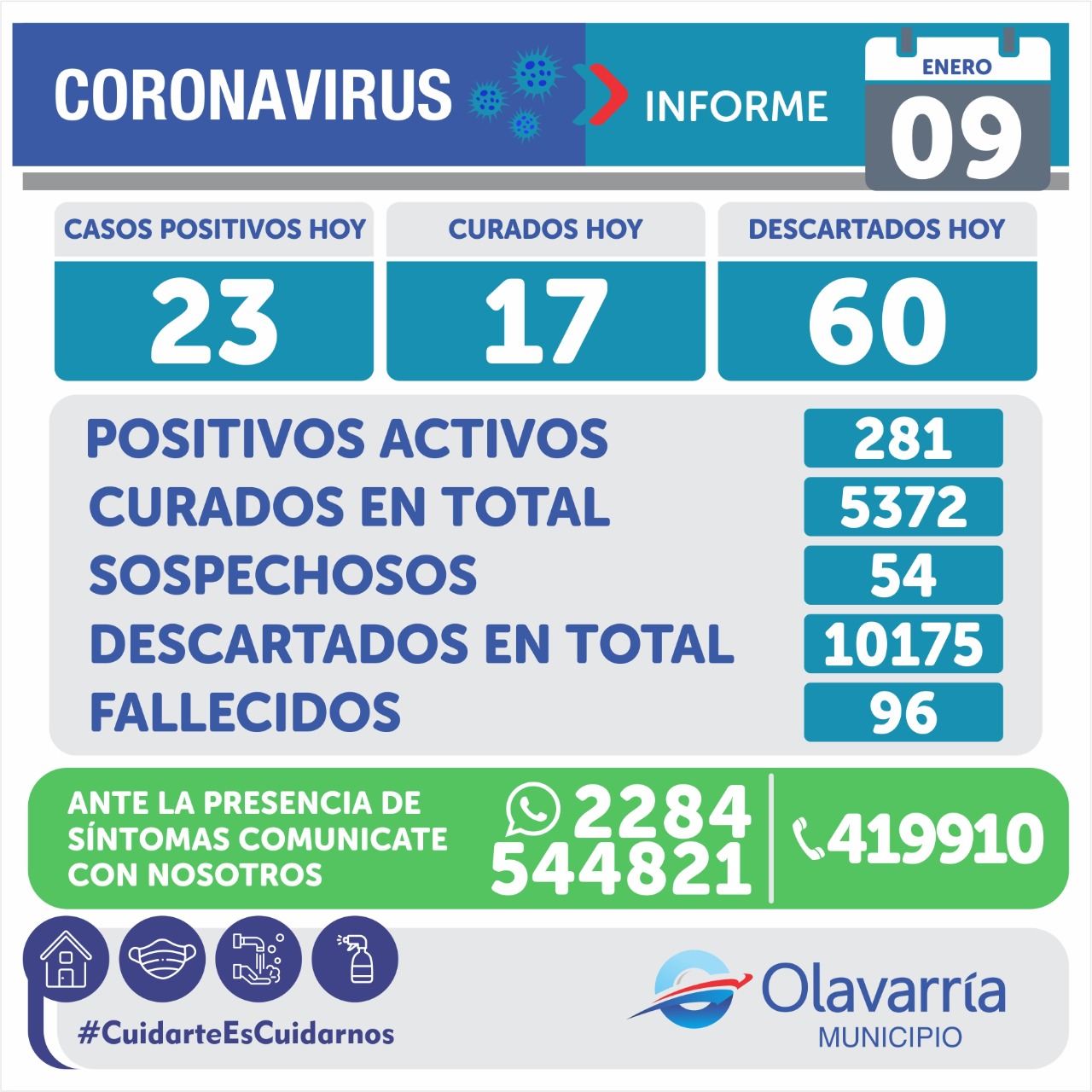 En la fecha de hoy 9 de enero se registraron 23 casos positivos, 17 altas médicas y 60 descartados.