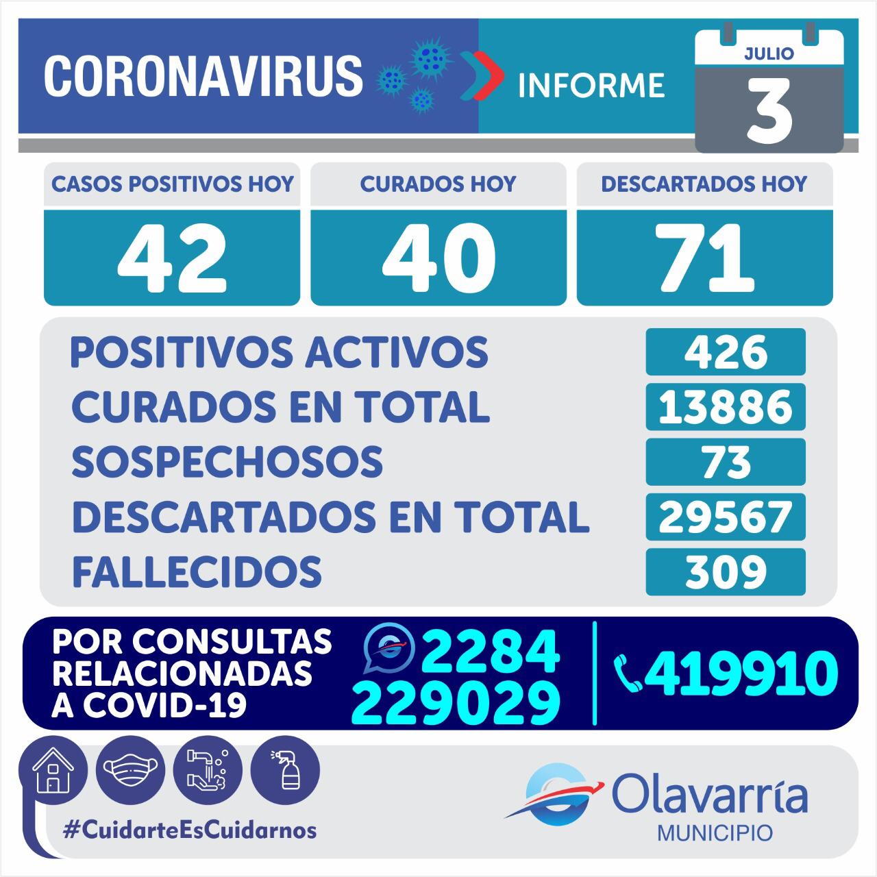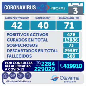 • Informe Sanitario: Se registraron 42 casos positivos de coronavirus y 40 altas medicas