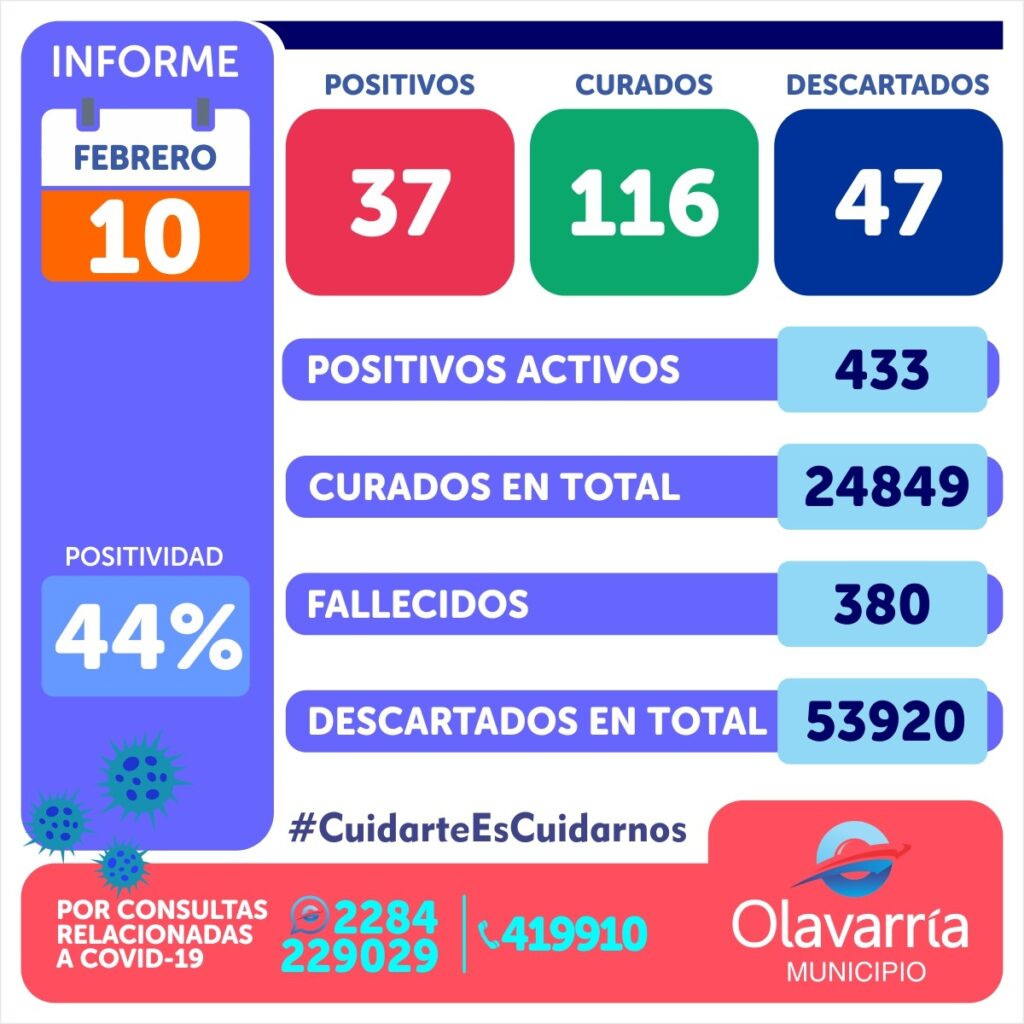 En el día de la fecha se analizaron 84 hisopados, de los cuales 37 fueron positivos y 47 negativos para Covid-19. La positividad de la jornada es del 44%.