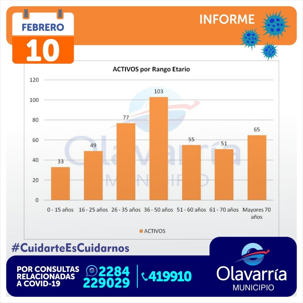 Asimismo se indicó que en el día de la fecha recibieron el alta médica 116 personas, por lo que el número de pacientes activos en Olavarría es 433. El promedio de edad es 45 años.
