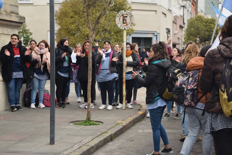 En el lugar la representante de SADOP en diálogo con los medios dijo “hoy estuvimos en el ministerio de trabajo con la audiencia de conciliación pasamos a un cuarto intermedio para el lunes a las 13hs, lo que nosotros queremos poner en evidencia es que las escuelas deben resolver sus conflictos con consensos adentro a través de los consejos académicos que no podemos avalar nosotros como sindicato un despido unilateral, un despido sin causa, queremos la democratización de las escuelas privadas. Acá tenemos el acompañamiento del movimiento obrero, frente unidad docente para pedir justicia y la reincorporación de la docente y la resolución de conflictos a través de consensos”.