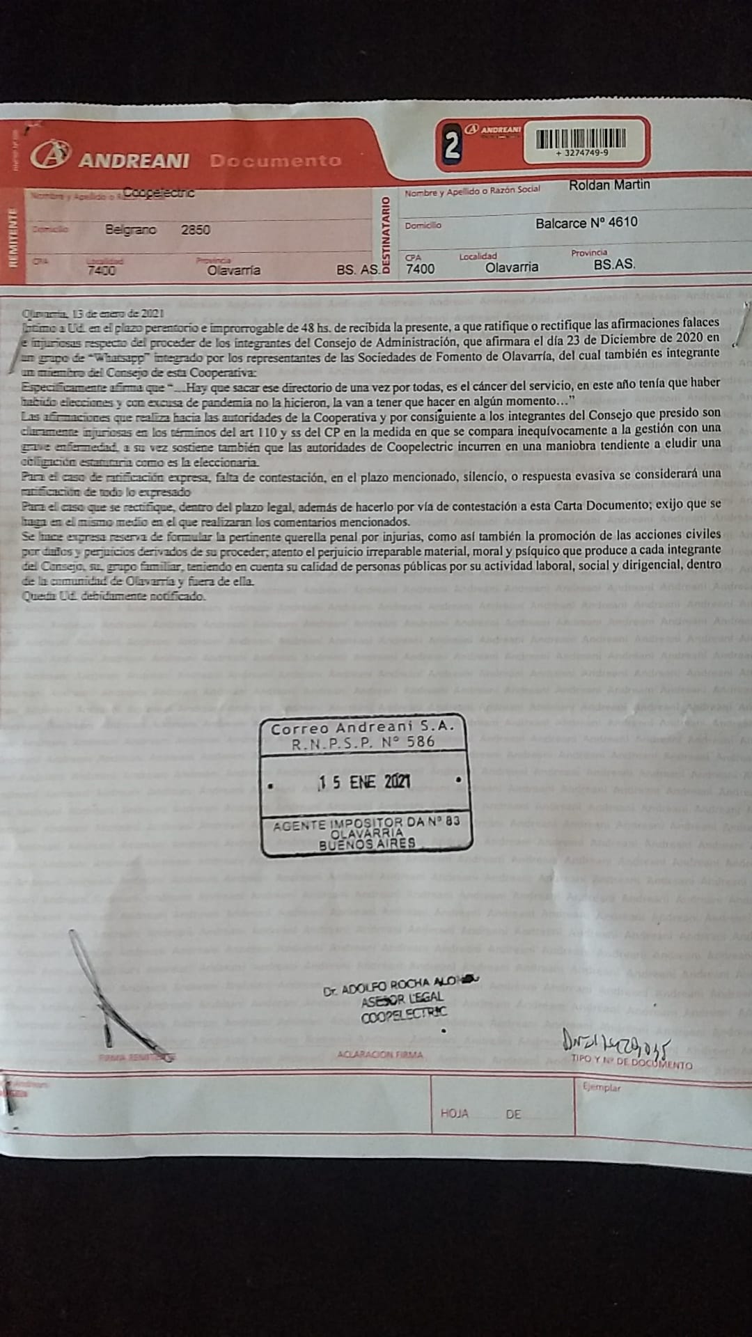“Ayer recibí esta carta documento de “intimación” por haber hecho declaraciones que a ellos no les gustaron dentro de un grupo de whats app” mencionó Roldán.